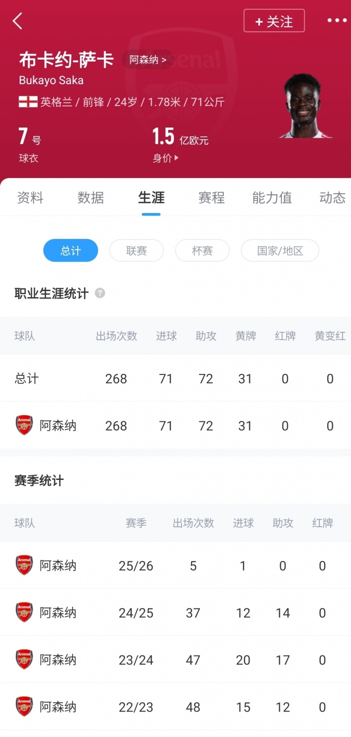 根据capology的数据,萨卡目前在阿森纳的周薪为19.5万镑,该合同在2023年5月签下。