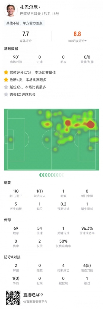 10月2日讯 欧冠联赛阶段第二轮比赛,扎巴尔尼踢满全场,帮助巴黎客场2-1击败巴萨。