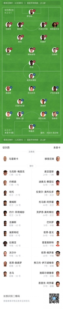 切尔西首发:1-桑切斯、3-库库雷利亚、5-巴迪亚西勒、23-查洛巴、27-古斯托、8-恩佐、25-凯塞多、40-博纳诺特、7-内托、32-乔治、49-加纳乔