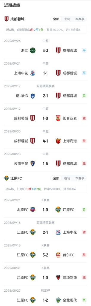 本场比赛是成都蓉城首个亚冠正赛主场。蓉城首轮客场不敌蔚山HD,暂排名亚冠第8;江原FC主场2-1战胜上海申花,积3分排名亚冠第4。