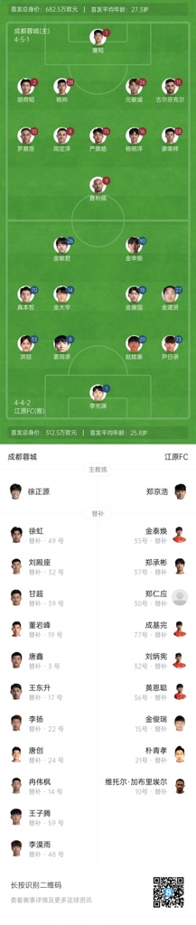 江原FC首发:1-李光渊、20-赵炫泰、33-洪喆、8-姜润求、14-金大宇、18-金康国、70-具本哲、26-金民俊、27-金道现、73-尹日录、90-金信珍